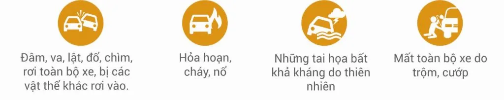 Đâm, va (bao gồm cả va chạm với vật thể khác ngoài xe ô tô), lật, đổ, chìm, rơi, bị các vật thể khác rơi vào.