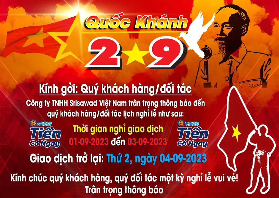 Kính gửi Quý khách hàng – Qúy đối tác, để thuận tiện cho Quý khách hàng trong việc sắp xếp thời gian giao dịch trong dịp Quốc khánh 2/9, Công ty TNHH Srisawad Việt Nam xin thông báo thời gian nghỉ lễ như sau: